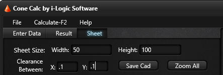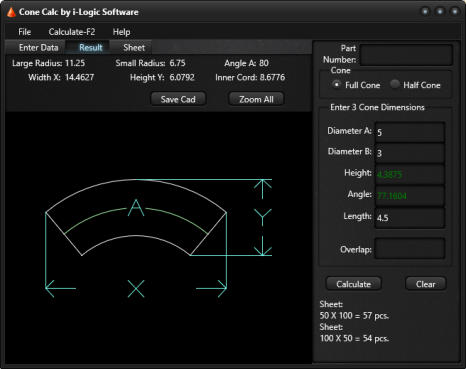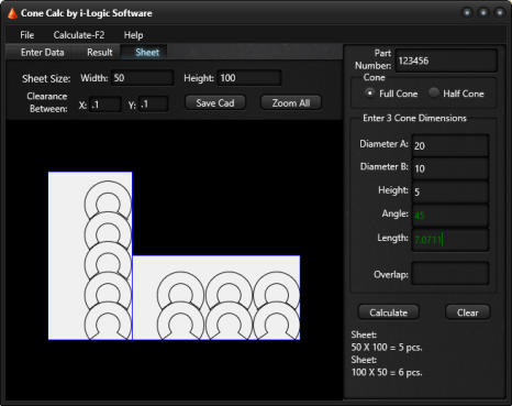 Optionally, you can enter the size of a sheet of material for calculating how many flat cone