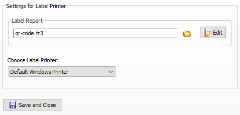 Click on the Folder button to choose the printer template to use. A template for your particular label printer can be made in the template editor. Set the template page size to the size your label printer prints. Add text or bar codes like you would on the other report templates.