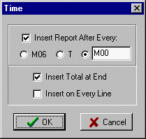 If the 'Insert Report After Every:' is checked it will insert a comment with the run time and segment time up to that point when it finds 'T' address, 'M6' code, or the entered string of characters, depending on which is checked.
