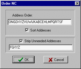 This utility puts the addresses on each line in a specified order. Enter a string of characters in the order that you want the addresses in the line of NC code to be ordered. This string will be saved to the machine format file when you save the current Configuration.