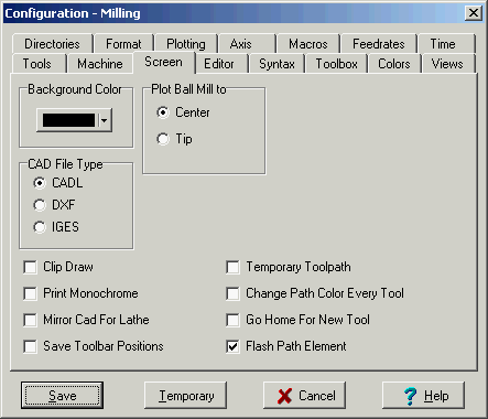 Temporary Toolpath -- When this is unchecked the toolpath plot is plotted as CAD elements in the plot window and saved to memory so when you zoom or change the view the toolpath is redrawn. You can also analyse the elements of the toolpath. When this is checked, the toolpath will disappear when the view is changed. You might need this when you don't want the toolpath to take up memory. The saved toolpath will be erased when you press the Redraw button (F3).