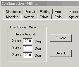 Set this view by entering how much to rotate around the X, Y, and Z axis from what is shown in the Top view. You can dynamically rotate the view around visually by holding down Alt key and dragging mouse with left button down. The Current button will insert this current screen view. The Default button will set it back to the default isometric view. Then press save.