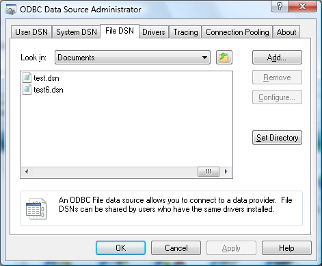Then exit the ODBC Source Administrator. A DSN file is just a text file with a connection string in it. You will have to add your password to the file if your database requires it. An example: