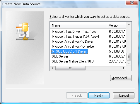 Pressing the Add button will bring up the Create New Data Source window. Find the driver for your database and click Next.