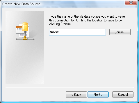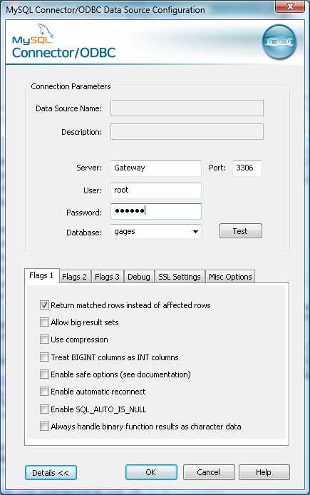 Fill in the items with your info. The actual database in MySQL doesn't have to be named "gages", just the DSN filename.