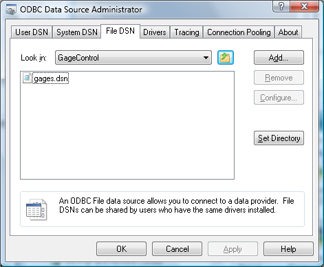 In Settings - Database - check the ODBC button in "Database Type" save and exit. When Gage Control starts up it will use the connection string contained in "gages.dsn" in the User Data Path.