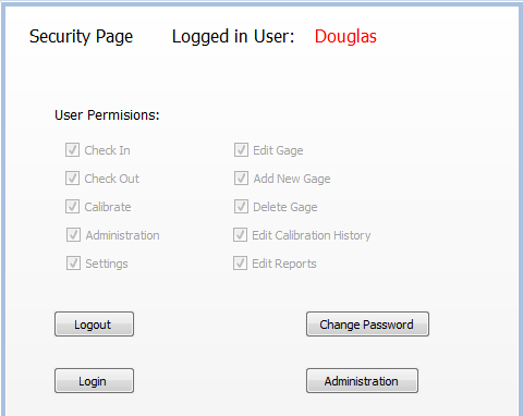 User Permissions - The checkboxes display what the current logged in user can has permission to do in the program.