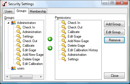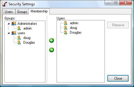 Membership - The membership list allows you to add and remove users to groups. The users will then have the permissions that are set for the group.
