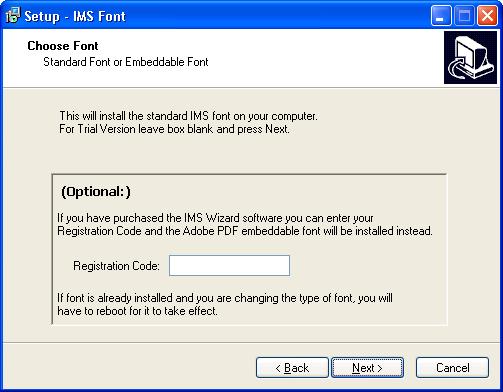 If you do not have a Registration Code, or you don't need to embed the font into Adobe PDF files, skip this page and press next. If you enter the Registration Code you received when you purchased the program it will install the embeddable font.