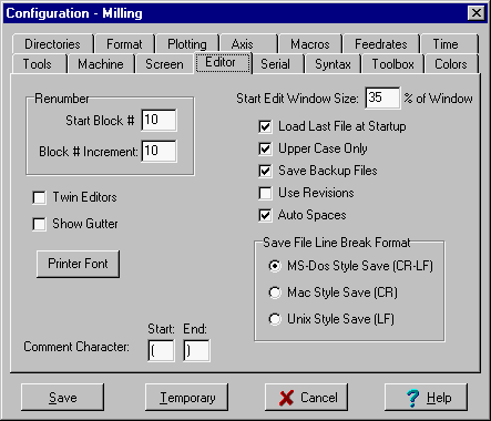 Lines in the editor that are surrounded by these characters will be interpreted as comments. The default character is '('. If the machine uses a different character to signify the start and end of a comment, you can enter it here. If the control uses one character at the beginning of the comment and nothing at the end of the line, leave the End Comment Char blank. Some functions in Inplot will skip over any line that has a comment character in it, so its best to have no other code on the line except the comment.