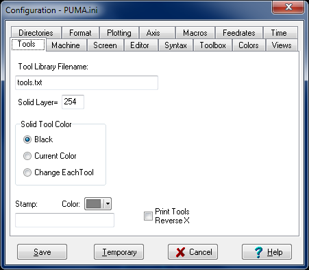 When 'Solids' is checked on the Main Menu, the cutting of the tool can be shown either as black or in a color. When 'Change Each Tool' is checked, the color of the tool will change at every 'T' or 'M6' code.
